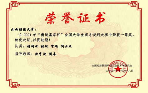 11月12日,永利官网在2021年“商谈赢家杯”全国大学生商务谈判大赛(中文赛道)中摘得全国大学生商务谈判大赛团队一等奖。这是继我校在10月31日“商谈赢家杯”全国大学生商务谈判大赛(英文赛道)中获得佳绩之后,我校参与该项赛事取得又一优异成绩。我校获奖队伍“春天会暗送秋波吗队”由yl23455永利官网段宇波、工商管理学院闫春老师联合指导,队员分别是来自yl23455永利官网2019级行政管理专业胡问世、闫士杰,2019级劳动与社会保障专业宋颂,会计学院2019级资产评估专业张敏。