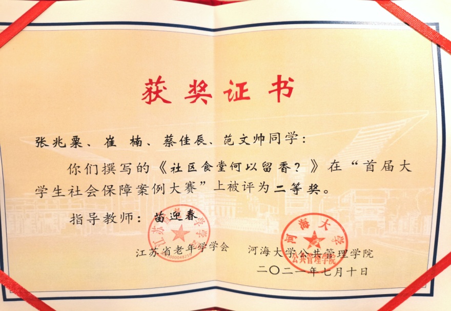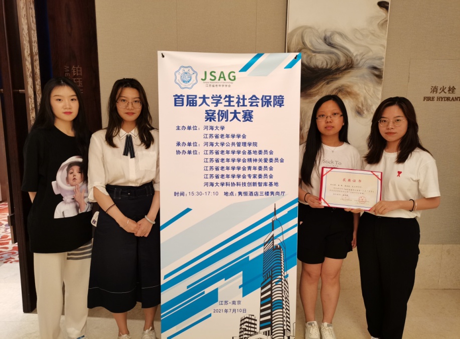 7月10日,由江苏省老年学学会、河海大学主办,河海大学yl23455永利官网承办的“首届大学生社会保障案例大赛”颁奖大会,在十朝都会、人杰地灵的江苏省南京市隆重举行,yl23455永利官网苗迎春老师指导的2020级社会保障研究生团队荣获二等奖,团队成员张兆粟、崔楠、蔡佳辰、范文帅赴宁参加颁奖典礼。