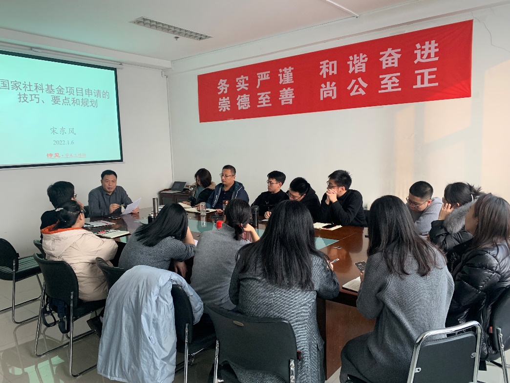 宋东风在总结中指出:申请国家社科基金项目,最重要的三个方面是项目选题依据、研究内容和创新之处,青年教师们应该结合自己的研究方向,考虑如何能够解决国家面临的重大理论和现实问题,要做一个有责任感和使命感的学者。