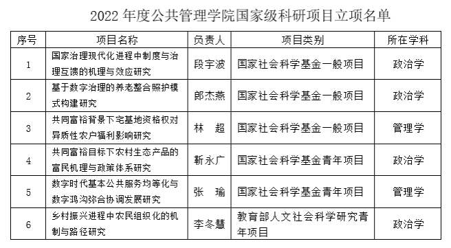 近年来,永利官网度重视国家级科研项目申报工作,每年及时对项目申报工作进行充分动员,并对项目申报工作提供精准指导和服务。今年李冬慧博士获批教育部人文社科青年项目1项,至此永利官网2022年共获批国家级科研项目6项。永利官网在国家级科研项目立项上取得重要突破,必将有力推动全院科研实力大幅提升,促进公共管理学科建设提档升级。