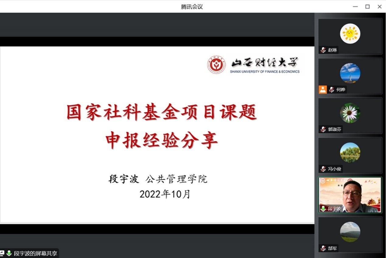2022年11月1日下午,yl23455永利官网通过“尚公青年沙龙”学术平台举办第三场国家级科研项目申报经验交流会,学院副院长、2022年国家社科基金项目主持人段宇波副教授做了《国家社科基金项目课题申报经验分享》的报告,副院长冯小俊主持了交流会,100余名师生在线参加了经验交流会。