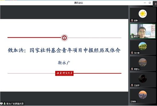 2022年11月15日下午,yl23455永利官网通过“尚公青年沙龙”学术平台举办第五场国家级科研项目申报经验交流会, 学院2022年国家社科基金项目主持人靳永广博士做了《国家社科基金青年项目申报经历及体会》的报告,副院长冯小俊主持了交流会,100余名师生在线参加了经验交流会。