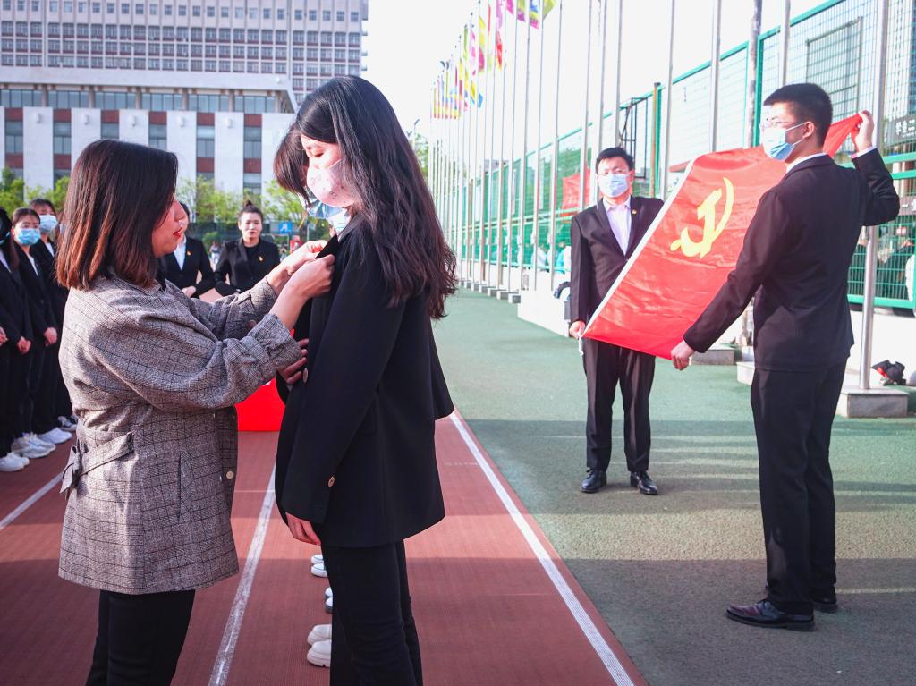 “我志愿加入中国共产党,拥护党的纲领,遵守党的章程……”,学院团委书记王琼带领在场党员重温入党誓词,大家紧握右拳,真挚地表达了对党的忠诚热爱和为共产主义奋斗终生的决心。随后,王老师为新发展党员佩戴党徽,并寄语:新的身份新的起点,不仅要组织上入党,更要思想和行动上入党,要时刻保持党员的先进性,坚持学习文化知识,不断提升理论素养,主动作为,乐于奉献,争做祖国合格的建设者和接班人。