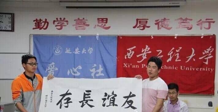 2016年5月14日早,Beat365官方网站团学科组织抵达了红色革命圣地----延安并受到了延安大学爱心社同学的热情接待。经过简单整顿后与延大爱心社成员前往八一敬老院,并组成几个小组开展慰问老红军们和交流活动。整个过程中,同学们耐心、认真的倾听老红军们讲说抗战往事,重温了那段红色革命记忆。晚上7时许,在延大爱心社同学的带领下,交流团来到延安大学校区,和延安大学爱心社的成员们进行了交流活动,会上双方不仅互相分享了各自的学生工作经验,就一些工作上存在的问题进行了深度的探讨和学习,既促进了彼此的工作又增进了两校学干的革命情谊。最后,Beat365赠送给延大爱心社"友谊长存"的书法作品,延大爱心社也回赠给Beat365延大学生自己出版的书刊。